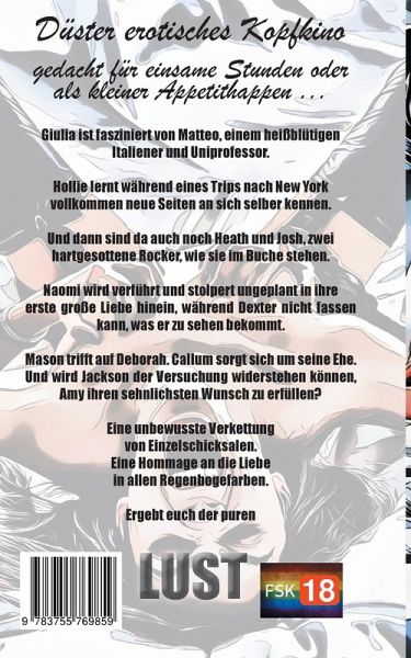 Dunkel-erotische Kurzgeschichten als anregender Einstieg in ein sündiges Abenteuer ...Giulia ist fasziniert von Matteo, einem heißblütigen Italiener und Uniprofessor.Hollie lernt während eines Trips nach New Yorkvollkommen neue Seiten an sich selber kennen. Und dann sind da auch noch Heath und Josh, zwei hartgesottene Rocker, wie sie im Buche stehen. Naomi wird verführt und stolpert ungeplant in ihre erste große Liebe hinein, während Dexter nicht fassen kann, was er zu sehen bekommt. Mason trifft auf Deborah. Callum sorgt sich um seine Ehe.Und wird Jackson der Versuchung widerstehen können, Amy ihren sehnlichsten Wunsch zu erfüllen?Eine unbewusste Verkettung von Einzelschicksalen.Eine Hommage an die Liebe in allen Regenbogefarben.