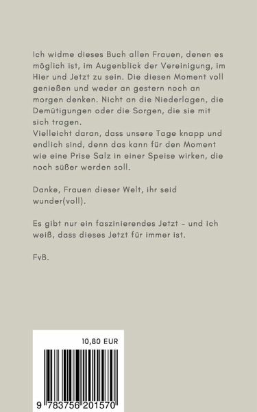 Ich widme dieses Buch allen Frauen, denen es möglich ist, im Augenblick der Vereinigung, im Hier und Jetzt zu sein. Die diesen Moment voll genießen und weder an gestern noch an morgen denken. Nicht an die Niederlagen, die Demütigungen oder die Sorgen, die sie mit sich tragen. Vielleicht daran, dass unsere Tage knapp und endlich sind, denn das kann für den Moment wie eine Prise Salz in einer Speise wirken, die noch süßer werden soll.Danke, Frauen dieser Welt, ihr seid wunder(voll).Es gibt nur ein faszinierendes Jetzt - und ich weiß, dass dieses Jetzt für immer ist.FvB.