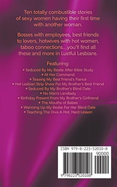 Ten totally combustible stories of sexy women having their first time with another woman. Bosses with employees, best friends to lovers, hotwives with hot women, taboo connections…you'll find all these and more in Lustful Lesbians. Featuring: • Seduced By My Bestie After Bible Study • At Her Command • Teasing My Best Friend's Fiancé • Hot Lesbian Strip Show For My Brother's Best Friend • Seduced By My Brother's Blind Date • No Man's Landlady • Birthday Present From My Brother's Girlfriend • The Mouths of Babes • Warming Up My Bestie For Her Blind Date • Teaching The Diva A Hot, Hard Lesson