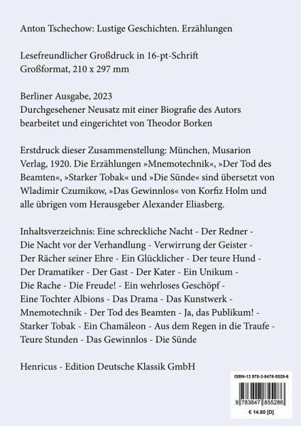 Anton Tschechow: Lustige Geschichten. ErzählungenLesefreundlicher Großdruck in 16-pt-SchriftGroßformat, 210 x 297 mmBerliner Ausgabe, 2023Durchgesehener Neusatz mit einer Biografie des Autors bearbeitet und eingerichtet von Theodor BorkenErstdruck dieser Zusammenstellung: München, Musarion Verlag, 1920. Die Erzählungen »Mnemotechnik«, »Der Tod des Beamten«, »Starker Tobak« und »Die Sünde« sind übersetzt von Wladimir Czumikow, »Das Gewinnlos« von Korfiz Holm und alle übrigen vom Herausgeber Alexander Eliasberg.Inhaltsverzeichnis:Lustige Geschichten.Eine schreckliche Nacht.Der Redner.Die Nacht vor der Verhandlung.Verwirrung der Geister.Der Rächer seiner Ehre.Ein Glücklicher.Der teure Hund.Der Dramatiker.Der Gast.Der Kater.Ein Unikum.Die Rache.Die Freude!Ein wehrloses Geschöpf.Eine Tochter Albions.Das Drama.Das Kunstwerk.Mnemotechnik.Der Tod des Beamten.Ja, das Publikum!Starker Tobak.Ein Chamäleon.Aus dem Regen in die Traufe.Teure Stunden.Das Gewinnlos.Die Sünde.Umschlagabbildung: Ivan Kramskoy, Kramskoi Ivan Mina Moiseev Sun, 1882Gesetzt aus der Minion Pro, 16 pt.Henricus - Edition Deutsche Klassik GmbHÜber den Autor:1860 in der südrussischen Hafenstadt Taganrog als Sohn einer bildungsbürgerlichen Familie geboren, studiert Anton Pawlowitsch Tschechow in Moskau Medizin. Den Arztberuf übt er zeitlebens nur nebenberuflich aus, doch schon während des Studiums veröffentlicht er erste Texte und wird bald zu einem der bekanntesten und einflussreichsten Schriftsteller Russlands. Seine zahlreichen Erzählungen, Dramen und Romane - in 23 Schaffensjahren entstehen über 600 literarische Werke - sind von der Lebenswelt der russischen Provinz inspiriert. Zurückhaltend und wertfrei schafft er mit seiner scharfen Beobachtungsgabe subtile Impressionen zwischenmenschlicher Beziehungen. Seine Tuberkuloseerkrankung zwingt ihn zu häufigen Kuraufenthalten im Ausland, so reist er im Sommer 1904 mit seiner Frau Olga Knipper nach Badenweiler im Schwarzwald. In der Nacht zum 15. Julistirbt dort mit Anton Tschechow einer der größten Schriftsteller der russischen Literaturgeschichte.