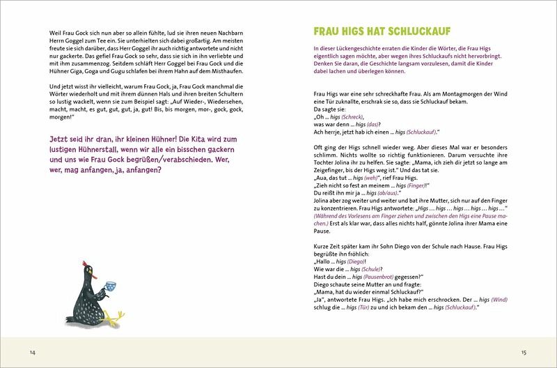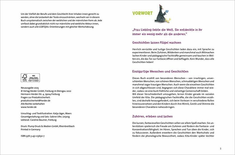 Die lustigen Vorlesegeschichten bieten ein Sammelsurium aus urkomischen, lustigen und verrückten Charakteren, die jedes Kinderherz zum Lachen bringen. Fantasiereich und wortgewandt nimmt die Autorin die kleinen Zuhörer mit in eine Welt voller Grimassen und Unsinn, die von Achtsamkeit und Miteinander in einer vielseitigen Gemeinschaft geprägt ist, und in die sich jedes Kind reinfühlen kann. Die wunderbar humorvoll beschriebenen Szenen bieten Erzähler:innen die Gelegenheit, selbst in die Rolle des Schauspielenden zu schlüpfen und die Geschichten mit Gestik und Mimik zu untermalen. Dabei beziehen kurze Zwischenfragen die Kinder in das Geschehen mit ein und geben ihnen Raum für ihre Gefühle und Stimmungen.