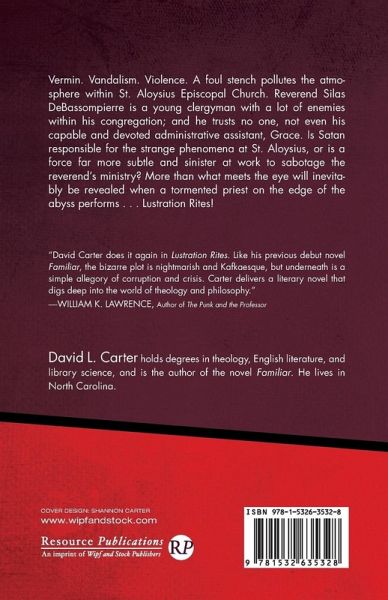 Vermin. Vandalism. Violence. A foul stench pollutes the atmosphere within St. Aloysius Episcopal Church. Reverend Silas DeBassompierre is a young clergyman with a lot of enemies within his congregation; and he trusts no one, not even his capable and devoted administrative assistant, Grace. Is Satan responsible for the strange phenomena at St. Aloysius, or is a force far more subtle and sinister at work to sabotage the reverend's ministry? More than what meets the eye will inevitably be revealed when a tormented priest on the edge of the abyss performs . . . Lustration Rites!
