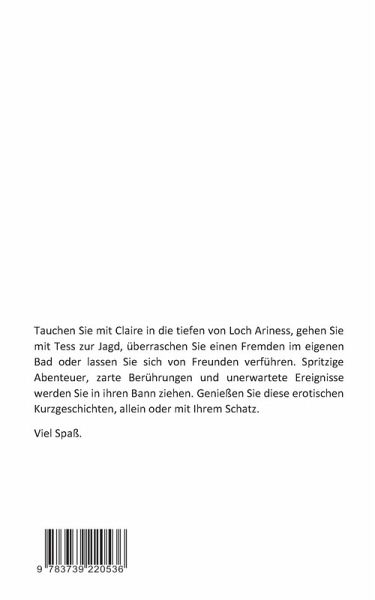 Tauchen Sie mit Claire in die tiefen von Loch Ariness, gehen Sie mit Tess zur Jagd, überraschen Sie einen Fremden im eigenen Bad oder lassen Sie sich von Freunden verführen. Spritzige Abenteuer, zarte Berührungen und unerwartete Ereignisse werden Sie in ihren Bann ziehen. Genießen Sie diese erotischen Kurzgeschichten, allein oder mit Ihrem Schatz. Viel Spaß.