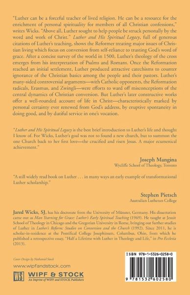 Jared Wicks, SJ, gained his doctorate at the University of Munster with the dissertation, Man Yearning for Grace: Luther's Early Spiritual Teaching (1969). He brought out the studies of this collection while teaching at Jesuit School of Theology in Chicago and the Gregorian University in Rome. His Luther and His Spiritual Legacy (1982) is a Wipf & Stock reprint of 2016. He served on the world-level Lutheran-Catholic Commission on Unity from 1986 to 2006 and was a drafter of the Lutheran-Catholic Declaration on the Way: Church, Ministry, and Eucharist (2015). While scholar-in-residence at the Pontifical College Josephinum, Columbus, Ohio, he published a retrospective essay, ""Half a Lifetime with Luther in Theology and Life,"" in Pro Ecclesia (2013).
