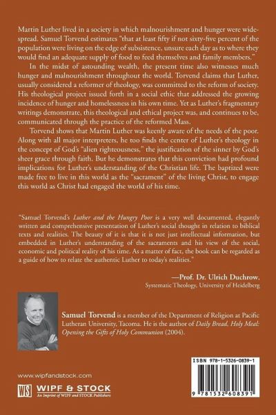 Martin Luther lived in a society in which malnourishment and hunger were widespread. Samuel Torvend estimates ""that at least fifty if not sixty-five percent of the population were living on the edge of subsistence, unsure each day as to where they would find an adequate supply of food to feed themselves and family members."" In the midst of astounding wealth, the present time also witnesses much hunger and malnourishment throughout the world. Torvend claims that Luther, usually considered a reformer of theology, was committed to the reform of society. His theological project issued forth in a social ethic that addressed the growing incidence of hunger and homelessness in his own time. Yet as Luther's fragmentary writings demonstrate, this theological and ethical project was, and continues to be, communicated through the practice of the reformed Mass. Torvend shows that Martin Luther was keenly aware of the needs of the poor. Along with all major interpreters, he too finds the center of Luther's theology in the concept of God's ""alien righteousness,"" the justification of the sinner by God's sheer grace through faith. But he demonstrates that this conviction had profound implications for Luther's understanding of the Christian life. The baptized were made free to live in this world as the ""sacrament"" of the living Christ, to engage this world as Christ had engaged the world of his time.