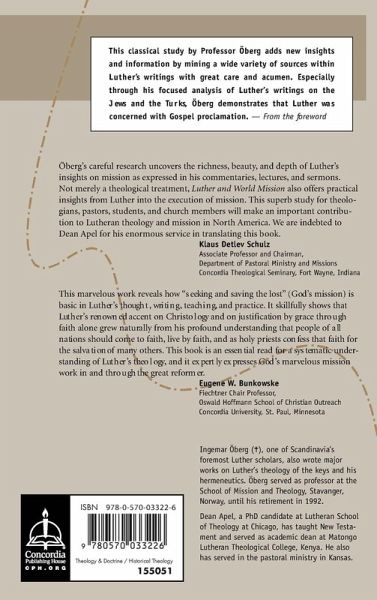 This book provides a new interpretation of Luther and mission and serves to "rehabilitate" the reformer in modern missiological studies. Öberg argues that Luther fully embraced the missionary task to the world. Because Luther was foremost a teacher and pastor, his writings interact with Scripture and address current, local situations. Yet in Luther's Bible exposition, pamphlets, and treatises, a clear and passionate commitment to the Gospel and world mission emerges. Shaped by a critical attitude toward Luther, past scholars have misinterpreted the reformer. An honest portrait recognizes Luther's subtle but solid contribution to evangelical missiology. In Luther and World Mission, Luther emerges as a mission-minded servant of the Gospel who laid the foundation for a Lutheran theology of mission.