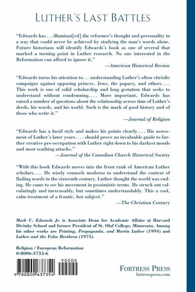 "Edwards has...illuminat[ed] the reformer's thought and personality in a way that could never be achieved by studying the man's words alone. Future historians will identify Edwards's book as one of several that marked a turning point in Luther research. No one interested in the Reformation can afford to ignore it." -- American Historical Review "Edwards turns his attention to...understanding Luther's often vitriolic campaigns against opposing princes, Jews, the papacy, and others.... This work is one of solid scholarship and long gestation that seeks to understand without condemning.... More important, Edwards has raised a number of questions about the relationship across time of Luther's deeds, his words, and his world. Such is the mark of good history and of those who write it." -- Journal of Religion "Edwards has a lucid style and makes his points clearly.... His assessment of Luther's later years...should prove an invaluable guide to further creative pre-occupation with Luther right down to his darkest moods and most scathing attacks." -- Journal of the Canadian Church Historical Society "With this book Edwards moves into the front rank of American Luther scholars.... He wisely counsels moderns to understand the context of flailing words in the sixteenth century. Luther thought the world was ending. He came to see his movement in pessimistic terms. He struck out calculatingly and inexcusably, but sometimes understandably. This a cool, calm treatment of a frantic, hot subject." -- The Christian Century