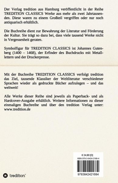 Dieses Werk ist Teil der Buchreihe TREDITION CLASSICS. Der Verlag tredition aus Hamburg veröffentlicht in der Buchreihe TREDITION CLASSICS Werke aus mehr als zwei Jahrtausenden. Diese waren zu einem Großteil vergriffen oder nur noch antiquarisch erhältlich. Mit der Buchreihe TREDITION CLASSICS verfolgt tredition das Ziel, tausende Klassiker der Weltliteratur verschiedener Sprachen wieder als gedruckte Bücher zu verlegen und das weltweit! Die Buchreihe dient zur Bewahrung der Literatur und Förderung der Kultur. Sie trägt so dazu bei, dass viele tausend Werke nicht in Vergessenheit geraten.