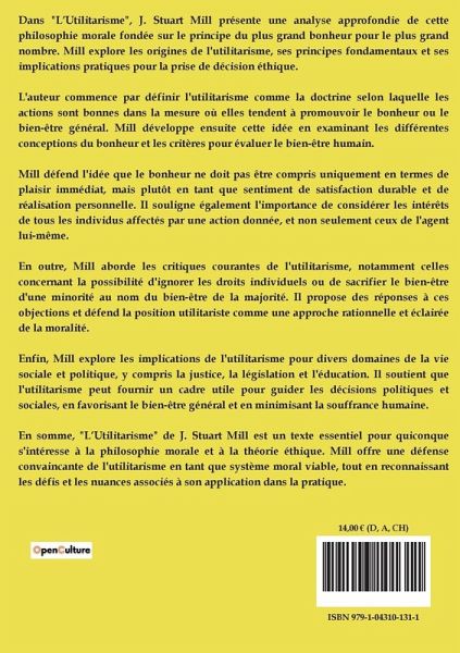 Dans "L¿Utilitarisme", J. Stuart Mill présente une analyse approfondie de cette philosophie morale fondée sur le principe du plus grand bonheur pour le plus grand nombre. Mill explore les origines de l'utilitarisme, ses principes fondamentaux et ses implications pratiques pour la prise de décision éthique. L'auteur commence par définir l'utilitarisme comme la doctrine selon laquelle les actions sont bonnes dans la mesure où elles tendent à promouvoir le bonheur ou le bien-être général. Mill développe ensuite cette idée en examinant les différentes conceptions du bonheur et les critères pour évaluer le bien-être humain. Mill défend l'idée que le bonheur ne doit pas être compris uniquement en termes de plaisir immédiat, mais plutôt en tant que sentiment de satisfaction durable et de réalisation personnelle. Il souligne également l'importance de considérer les intérêts de tous les individus affectés par une action donnée, et non seulement ceux de l'agent lui-même. En outre, Mill aborde les critiques courantes de l'utilitarisme, notamment celles concernant la possibilité d'ignorer les droits individuels ou de sacrifier le bien-être d'une minorité au nom du bien-être de la majorité. Il propose des réponses à ces objections et défend la position utilitariste comme une approche rationnelle et éclairée de la moralité. Enfin, Mill explore les implications de l'utilitarisme pour divers domaines de la vie sociale et politique, y compris la justice, la législation et l'éducation. Il soutient que l'utilitarisme peut fournir un cadre utile pour guider les décisions politiques et sociales, en favorisant le bien-être général et en minimisant la souffrance humaine. En somme, "L¿Utilitarisme" de J. Stuart Mill est un texte essentiel pour quiconque s'intéresse à la philosophie morale et à la théorie éthique. Mill offre une défense convaincante de l'utilitarisme en tant que système moral viable, tout en reconnaissant les défis et les nuances associés à son application dans la pratique.