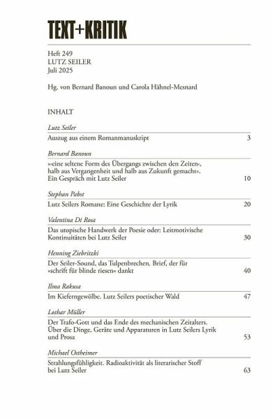 "Ohne seine Stimme, seinen Ton, seine Sprachmagie und sein Formbewusstsein wäre die deutsche Gegenwartsliteratur ärmer, sehr viel ärmer." Lothar Müller, Laudatio zum Georg-Büchner-PreisLutz Seiler gehört seit mehr als 25 Jahren zu den bedeutendsten Autoren der deutschsprachigen Gegenwartsliteratur. Sein Lyrik, Essay, Prosa und Roman umfassendes Werk wurde in zahlreiche Sprachen übersetzt und vielfach mit Preisen gewürdigt - ein Höhepunkt war 2023 der Georg- Büchner-Preis.Seilers Gedichte sondieren auf eindringliche Weise die Herkunftswelt der zwischen thüringischen Uran-Abraumhalden verbrachten Kindheit. Seine Erzählungen und Romane entwerfen zeithistorisch verankerte und doch stark literarisierte und poetisch aufgeladene Figuren, die die späten Jahre der DDR, den gesellschaftlichen Umbruch von 1989 und dessen Folgen erlebbar machen und reflektieren.Die Beiträge des Heftes untersuchen die vielfältigen Aspekte des Werks, sie nehmen die Spuren der Lyrik im Roman in den Blick, beleuchten lyrische Leitmotive, interessieren sich für Dinge, Geräte und Apparaturen sowie für die literarische Wirkung der Radioaktivität und gehen dem französischen und amerikanischen Traum von Seilers Romanfiguren nach. Das Heft enthält einen noch unveröffentlichten Auszug aus einem neuen Roman.Im Mittelpunkt der bereits 1962 gegründeten Zeitschrift für Literatur TEXT+KRITIK stehen Autorinnen und Autoren sowie aktuelle Themen der deutschsprachigen Literatur, vor allem der Gegenwart, aber auch der Literaturgeschichte - die Spannweite reicht von Martin Luther über Juli Zeh bis hin zu Mangas, Comics und Graphic Novels und zu Fragen digitaler Literatur und künstlicher Intelligenz. TEXT+KRITIK vermittelt Literatur, macht mit Analysen und kritischen Essays Lust auf Lektüre und richtet sich an alle, die an literarischen Fragen interessiert sind und sich mit Literatur beschäftigen. Die Herausgebenden und Beitragenden der Reihe sind ausgewiesene Fachleute aus Wissenschaft, Journalismus und Kulturvermittlung sowie die Autorinnen und Autoren selbst.