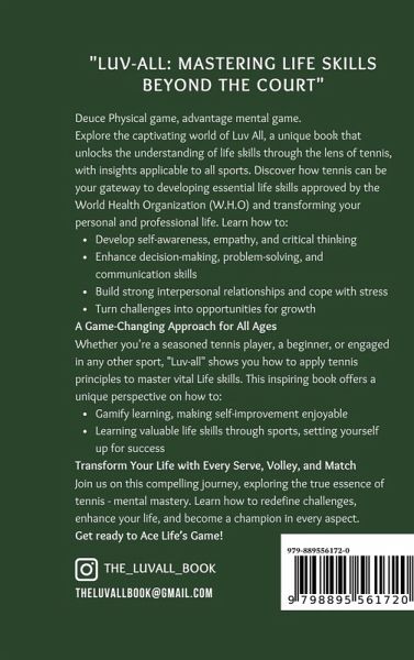 Deuce Physical game, advantage mental game. Explore the captivating world of Luv All, a unique book that unlocks the understanding of life skills through the lens of tennis, with insights applicable to all sports. Discover how tennis can be your gateway to developing essential life skills approved by the World Health Organization (W.H.O) and transforming your personal and professional life. Learn how to: Develop self-awareness, empathy, and critical thinking Enhance decision-making, problem-solving, and communication skills Build strong interpersonal relationships and cope with stress Turn challenges into opportunities for growth A Game-Changing Approach for All Ages Whether you're a seasoned tennis player, a beginner, or engaged in any other sport, "Luv-all" shows you how to apply tennis principles to master vital Life skills. This inspiring book offers a unique perspective on how to: Gamify learning, making self-improvement enjoyable Learning valuable life skills through sports, setting yourself up for success Transform Your Life with Every Serve, Volley, and Match Join us on this compelling journey, exploring the true essence of tennis - mental mastery. Learn how to redefine challenges, enhance your life, and become a champion in every aspect. Get ready to Ace Life's Game!