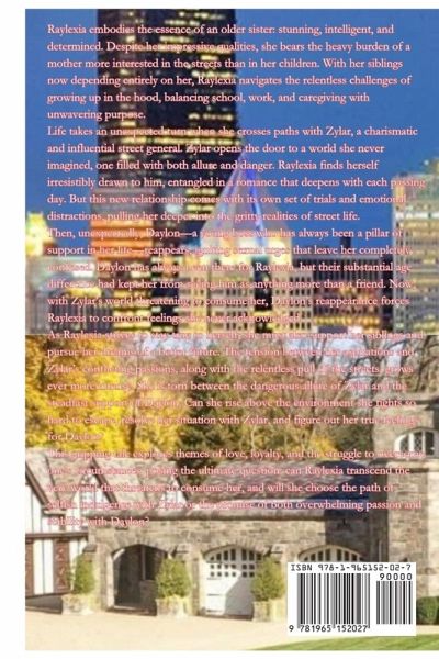 Raylexia embodies the essence of an older sister: stunning, intelligent, and determined. Despite her impressive qualities, she bears the heavy burden of a mother more interested in the streets than in her children. With her siblings now depending entirely on her, Raylexia navigates the relentless challenges of growing up in the hood, balancing school, work, and caregiving with unwavering purpose. Life takes an unexpected turn when she crosses paths with Zylar, a charismatic and influential street general. Zylar opens the door to a world she never imagined, one filled with both allure and danger. Raylexia finds herself irresistibly drawn to him, entangled in a romance that deepens with each passing day. But this new relationship comes with its own set of trials and emotional distractions, pulling her deeper into the gritty realities of street life. Then, unexpectedly, Daylon-a young boss who has always been a pillar of support in her life-reappears, igniting sexual urges that leave her completely confused. Daylon has always been there for Raylexia, but their substantial age difference had kept her from seeing him as anything more than a friend. Now, with Zylar's world threatening to consume her, Daylon's reappearance forces Raylexia to confront feelings she never acknowledged. As Raylexia strives to stay true to herself, she must also support her siblings and pursue her dreams of a better future. The tension between her aspirations and Zylar's conflicting passions, along with the relentless pull of the streets, grows ever more intense. She is torn between the dangerous allure of Zylar and the steadfast support of Daylon. Can she rise above the environment she fights so hard to escape, resolve her situation with Zylar, and figure out her true feelings for Daylon? This gripping tale explores themes of love, loyalty, and the struggle to overcome one's circumstances, posing the ultimate question: can Raylexia transcend the very world that threatens to consume her, and will she choose the path of selfish indulgence with Zylar or the promise of both overwhelming passion and stability with Daylon?