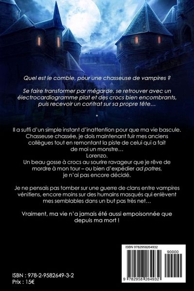 Quel est le comble, pour une chasseuse de vampires ? Se faire transformer par mégarde, se retrouver avec un électrocardiogramme plat et des crocs bien encombrants, puis recevoir un contrat sur sa propre tête... * Il a suffi d'un simple instant d'inattention pour que ma vie bascule. Chasseuse chassée, je dois maintenant fuir mes anciens collègues tout en remontant la piste de celui qui a fait de moi un monstre... Lorenzo. Un beau gosse à crocs au sourire ravageur que je rêve de mordre à mon tour - ou bien d'expédier ad patres, je n'ai pas encore décidé. Je ne pensais pas tomber sur une guerre de clans entre vampires vénitiens, encore moins sur des humains masqués qui enlèvent mes semblables dans un but pas très net... Vraiment, ma vie n'a jamais été aussi empoisonnée que depuis ma mort !