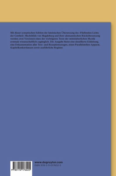 Mit dieser synoptischen Edition der lateinischen Übersetzung des Fließenden Lichts der Gottheit Mechthilds von Magdeburg und ihrer alemannischen Rückübersetzung werden zwei Versionen eines der wichtigsten Texte der mittelalterlichen Mystik erstmals wissenschaftlich zugänglich. Mechthilds in der zweiten Hälfte des 13. Jahrhunderts entstandenes Buch thematisiert in lyrischen, hymnischen und dramatischen Textpartien die Vereinigung der menschlichen Seele mit Gott, berichtet von Visionserlebnissen und enthält Gebete sowie lehrhafte und reflektierende Abschnitte mit Bezug zur Zeitsituation. In der Forschung gilt das Werk als Beginn volkssprachlicher mystischer Literatur überhaupt.