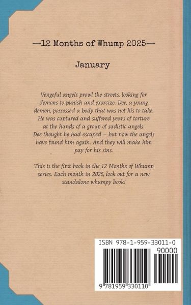 Vengeful angels prowl the streets, looking for demons to punish and exorcize. Dee, a young demon, possessed a body that was not his to take. He was captured and suffered years of torture at the hands of a group of sadistic angels. Dee thought he had escaped - but now the angels have found him again. And they will make him pay for his sins. This is the first book in the 12 Months of Whump series. Each month in 2025, look out for a new standalone whumpy book!