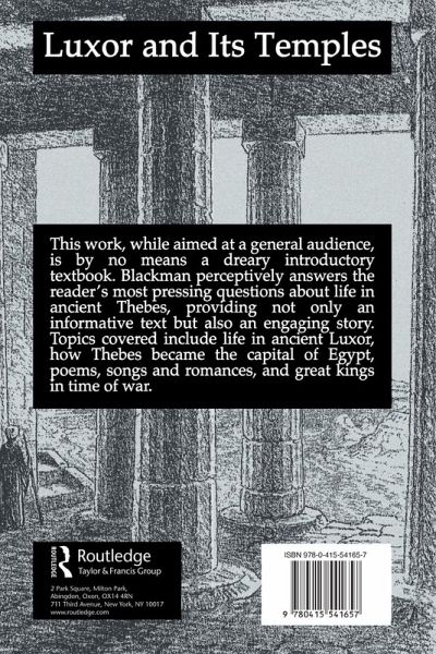 First published in 2005. This work, while aimed at a general audience, is by no means a dreary introductory textbook. Blackman perceptively answers the reader's most pressing questions about life in ancient Thebes, providing not only an informative text but also an engaging story. Topics covered include life in ancient Luxor, how Thebes became the capital of Egypt, poems, songs and romances, and great kings in time of war.