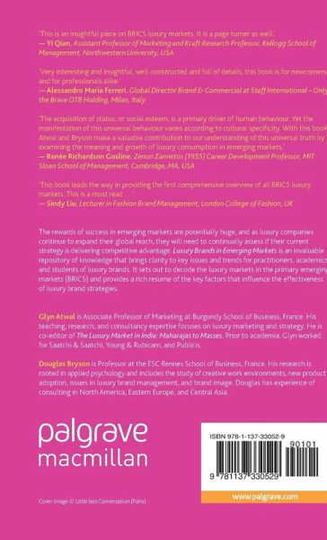 This book is an invaluable repository of knowledge that brings clarity to key issues and trends for practitioners, academics and students of luxury brands. It sets out to decode the luxury markets in the primary emerging markets (BRICs) and provide a rich resume of the key factors that influence the effectiveness of luxury brand strategies.