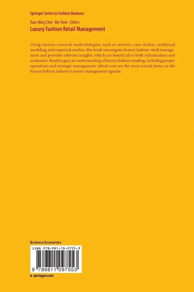 Using various research methodologies, such as reviews, case studies, analytical modeling and empirical studies, this book investigates luxury fashion retail management and provides relevant insights, which are beneficial to both industrialists and academics. Readers gain an understanding of luxury fashion retailing, including proper operations and strategic management, which now are the most crucial items on the luxury fashion industry's senior management agenda.