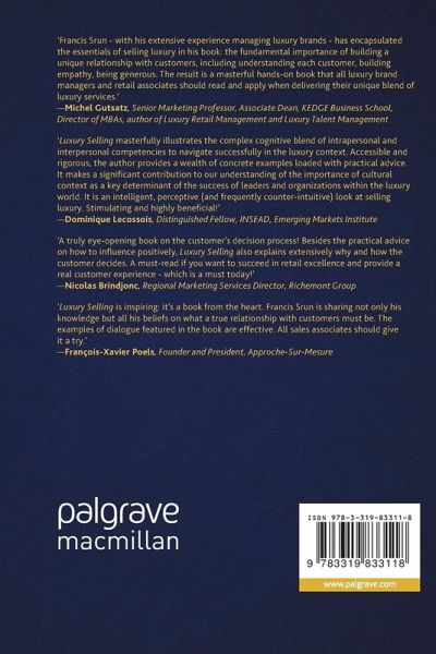 Finally this book guides you step by step with concrete examples and useful techniques through the seven steps of luxury selling: be prepared to sell, welcome appropriately, listen genuinely, propose and present with style, meet objections with persuasion rather than refutation, conclude sharply and finally gain loyalty for a long term relationship.