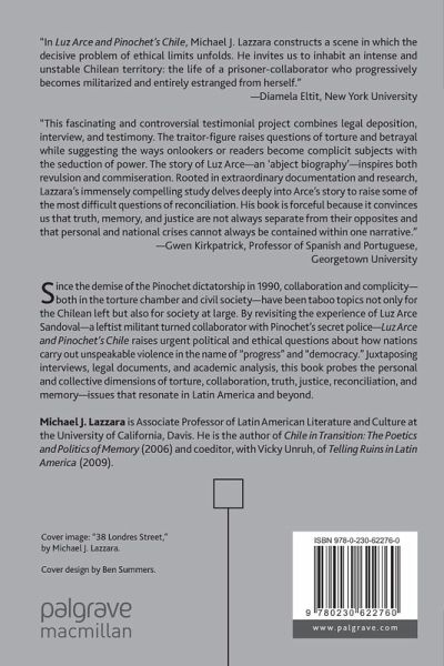 "In Luz Arce and Pinochet's Chile, Michael J. Lazzara constructs a scene in which the decisive problem of ethical limits unfolds. He invites us to inhabit an intense and unstable Chilean territory: the life of a prisoner-collaborator who progressively becomes militarized and entirely estranged from herself." - Diamela Eltit, New York University