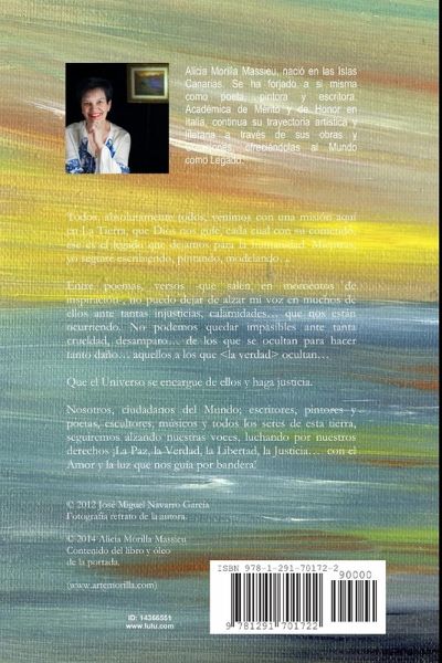 Todos, absolutamente todos, venimos con una misión aquí en La Tierra, que Dios nos guíe, cada cual con su cometido, ese es el legado que dejamos para la humanidad. Mientras, yo seguiré escribiendo, pintando, modelando... La luz que agoniza... será la revelación del mañana... para amanecer cada día... Entre poemas, versos -que salen en momentos de inspiración-, no puedo dejar de alzar mi voz en muchos de ellos ante tantas injusticias, calamidades... que nos están ocurriendo. No podemos quedar impasibles ante tanta crueldad, desamparo... de los que se ocultan para hacer tanto daño... aquellos a los que ocultan... Que el Universo se encargue de ellos y haga justicia. Nosotros, ciudadanos del Mundo; escritores, pintores y poetas, escultores, músicos y todos los seres de esta tierra, seguiremos alzando nuestras voces, luchando por nuestros derechos ¡La Paz, la Verdad, la Libertad, la Justicia... con el Amor y la luz que nos guía por bandera! Página Web de la Autora www.artemorilla.com