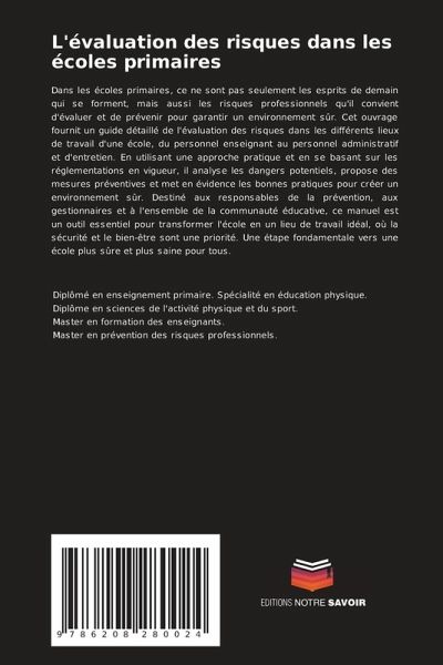 Dans les écoles primaires, ce ne sont pas seulement les esprits de demain qui se forment, mais aussi les risques professionnels qu'il convient d'évaluer et de prévenir pour garantir un environnement sûr. Cet ouvrage fournit un guide détaillé de l'évaluation des risques dans les différents lieux de travail d'une école, du personnel enseignant au personnel administratif et d'entretien. En utilisant une approche pratique et en se basant sur les réglementations en vigueur, il analyse les dangers potentiels, propose des mesures préventives et met en évidence les bonnes pratiques pour créer un environnement sûr. Destiné aux responsables de la prévention, aux gestionnaires et à l'ensemble de la communauté éducative, ce manuel est un outil essentiel pour transformer l'école en un lieu de travail idéal, où la sécurité et le bien-être sont une priorité. Une étape fondamentale vers une école plus sûre et plus saine pour tous.