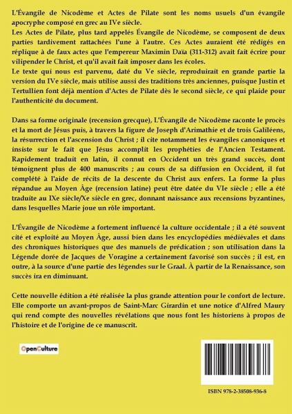 L'Évangile de Nicodème et Actes de Pilate sont les noms usuels d'un évangile apocryphe composé en grec au IVe siècle. Les Actes de Pilate, plus tard appelés Évangile de Nicodème, se composent de deux parties tardivement rattachées l'une à l'autre. Ces Actes auraient été rédigés en réplique à de faux actes que l'empereur Maximin Daïa (311-312) avait fait écrire pour vilipender le Christ, et qu'il avait fait imposer dans les écoles. Le texte qui nous est parvenu, daté du Ve siècle, reproduirait en grande partie la version du IVe siècle, mais utilise aussi des traditions très anciennes, puisque Justin et Tertullien font déjà mention d'Actes de Pilate dès le second siècle, ce qui plaide pour l'authenticité du document. Dans sa forme originale (recension grecque), L'Évangile de Nicodème raconte le procès et la mort de Jésus puis, à travers la figure de Joseph d'Arimathie et de trois Galiléens, la résurrection et l'ascension du Christ ; il cite notamment les évangiles canoniques et insiste sur le fait que Jésus accomplit les prophéties de l'Ancien Testament. Rapidement traduit en latin, il connut en Occident un très grand succès, dont témoignent plus de 400 manuscrits ; au cours de sa diffusion en Occident, il fut complété à l'aide de récits de la descente du Christ aux enfers. La forme la plus répandue au Moyen Âge (recension latine) peut être datée du VIe siècle ; elle a été traduite au IXe siècle/Xe siècle en grec, donnant naissance aux recensions byzantines, dans lesquelles Marie joue un rôle important. L'Évangile de Nicodème a fortement influencé la culture occidentale ; il a été souvent cité et exploité au Moyen Âge, aussi bien dans les encyclopédies médiévales et dans des chroniques historiques que des manuels de prédication ; son utilisation dans la Légende dorée de Jacques de Voragine a certainement favorisé son succès ; il est, en outre, à la source d'une partie des légendes sur le Graal. À partir de la Renaissance, son succès ira en diminuant. Cette nouvelle édition a été réalisée la plus grande attention pour le confort de lecture. Elle comporte un avant-propos de Saint-Marc Girardin et une notice d'Alfred Maury qui rend compte des nouvelles révélations que nous font les historiens à propos de l'histoire et de l'origine de ce manuscrit.