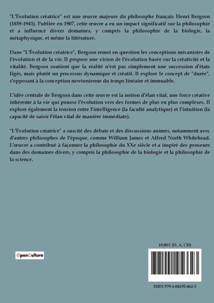 "L'Évolution créatrice" est une ¿uvre majeure du philosophe français Henri Bergson (1859-1941). Publiée en 1907, cette ¿uvre a eu un impact significatif sur la philosophie et a influencé divers domaines, y compris la philosophie de la biologie, la métaphysique, et même la littérature. Dans "L'Évolution créatrice", Bergson remet en question les conceptions mécanistes de l'évolution et de la vie. Il propose une vision de l'évolution basée sur la créativité et la vitalité. Bergson soutient que la réalité n'est pas simplement une succession d'états figés, mais plutôt un processus dynamique et créatif. Il explore le concept de "durée", s'opposant à la conception newtonienne du temps linéaire et immuable. L'idée centrale de Bergson dans cette ¿uvre est la notion d'élan vital, une force créative inhérente à la vie qui pousse l'évolution vers des formes de plus en plus complexes. Il explore également la tension entre l'intelligence (la faculté analytique) et l'intuition (la capacité de saisir l'élan vital de manière immédiate). "L'Évolution créatrice" a suscité des débats et des discussions animés, notamment avec d'autres philosophes de l'époque, comme William James et Alfred North Whitehead. L'¿uvre a contribué à façonner la philosophie du XXe siècle et a inspiré des penseurs dans des domaines divers, y compris la philosophie de la biologie et la philosophie de la science.