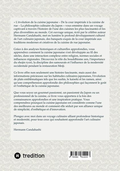 Découvrez la philosophie fascinante de la cuisine japonaise - dans toute sa profondeur, son histoire et sa diversité !Plongez dans le voyage culinaire unique « L'évolution de la cuisine japonaise - De la cour impériale à la cuisine de rue - La philosophie culinaire du Japon », un ouvrage de référence complet sur le développement de la culture culinaire japonaise, des premiers banquets impériaux à la cuisine de rue moderne dans les rues animées de Tokyo et d'Osaka.Cet ouvrage exceptionnel du célèbre auteur Hermann Candahashi allie analyse scientifique populaire, profondeur culturelle et récits captivants dans un mélange fascinant qui ravira les passionnés d'histoire, les passionnés de cuisine, les amoureux du Japon et les lecteurs spécialisés. Des influences du bouddhisme zen à la culture culinaire rigoureuse des samouraïs, en passant par les influences occidentales de l'ère Meiji, vous découvrirez ici comment le goût, la philosophie et l'esthétique ont évolué au Japon au fil des siècles.Ce qui rend ce livre si spécial :- Un regard unique sur les racines historiques de la cuisine japonaise- Des informations approfondies sur les spécialités régionales d'Hokkaido à Okinawa- Des éclairages passionnants sur l'importance du shojin ryori, du kaiseki et des sushis- Une présentation accessible aux profanes, mais approfondie pour les experts- Idéal pour les gourmets, les japonologues, les voyageurs, les blogueurs culinaires et les chefs professionnelsDécouvrez pourquoi la cuisine japonaise est aujourd'hui l'une des plus réputées au monde et comment des traditions profondément ancrées, des influences religieuses, des particularités régionales et des bouleversements historiques continuent de la façonner.Un incontournable pour tous ceux qui souhaitent savoir : ce qui rend la cuisine japonaise si unique et que pouvons-nous en apprendre ?Grâce à cet ouvrage aux multiples facettes, entrez dans un monde de plaisir, de connaissances et de richesse culturelle : pour votre bibliothèque, votre cuisine ou votre prochaine aventure au Japon !