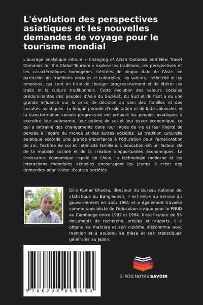 L'ouvrage analytique intitulé « Changing of Asian Outlooks and New Travel Demands for the Global Tourism » explore les traditions, les perspectives et les caractéristiques homogènes héritées de longue date de l'Asie, en particulier les traditions sociales et culturelles, les valeurs, l'ethnicité et les émotions, qui sont en train de changer progressivement et de libérer les traits et la culture traditionnels. Cette évolution des valeurs sociales prédominantes des peuples d'Asie du Sud-Est, du Sud et de l'Est a eu une grande influence sur la prise de décision au sein des familles et des sociétés asiatiques. La longue période d'exploitation et de lutte coloniales et la transformation sociale progressive ont préparé les peuples asiatiques à accroître leur autonomie, leur estime de soi et leur essor économique, ce qui a entraîné des changements dans leur mode de vie et leur liberté de pensée à l'égard du monde et des autres sociétés. La tradition culturelle asiatique accorde une grande importance à l'éducation pour l'amélioration de soi, l'estime de soi et l'ethnicité familiale. L'éducation est un facteur clé de la mobilité sociale et de la création d'opportunités économiques. La croissance économique rapide de l'Asie, la technologie moderne et les interactions mondiales actuelles encouragent les jeunes à créer des demandes pour visiter d'autres sociétés.