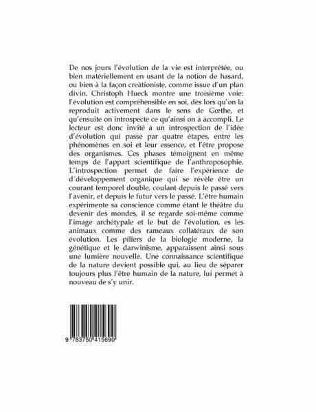 De nos jours l'évolution de la vie est interprétée, ou bien matériellement en usant de la notion de hasard, ou bien à la façon creàtioniste, comme issue d'un plan divin. Christoph Hueck montre une troisième voie: l'évolution est compréhensible en soi, dès lors qu'on la reproduit activement dans le sens de Goethe, et qu'ensuite on introspecte ce qu'ainsi on a accompli. Le lecteur est donc invité à un introspection de l'idée d'évolution qui passe par quatre étapes, entre les phénomènes en soi et leur essence, et l'être propose des organismes. Ces phases témoignent en même temps de l'appart scientifique de l'anthroposophie. L'introspection permet de faire l'expérience de d développement organique qui se révèle être un courant temporel double, coulant depuis le passé vers l'avenir, et depuis le futur vers le passé. L'être humain expérimente sa conscience comme étant le théâtre du devenir des mondes, il se regarde soi-même comme l'image archétypale et le but de l'évolution, es les animaux comme des rameaux collatéraux de son évolution. Les piliers de la biologie moderne, la génétique et le darwinisme, apparaissent ainsi sous une lumière nouvelle. Une connaissance scientifique de la nature devient possible qui, au lieu de séparer toujours plus l'être humain de la nature, lui permet à nouveau de s'y unir.