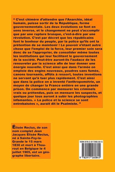" C’est chimère d’attendre que l’Anarchie, idéal humain, puisse sortir de la République, forme gouvernementale. Les deux évolutions se font en sens inverse, et le changement ne peut s’accomplir que par une rupture brusque, c’est-à-dire par une révolution. C’est par décret que les républicains font le bonheur du peuple, par la police qu’ils ont la prétention de se maintenir ! Le pouvoir n’étant autre chose que l’emploi de la force, leur premier soin sera donc de se l’approprier, de consolider même toutes les institutions qui leur facilitent le gouvernement de la société. Peut-être auront-ils l’audace de les renouveler par la science afin de leur donner une énergie nouvelle. C’est ainsi que dans l’armée on emploie des engins nouveaux, poudres sans fumée, canons tournants, affûts à ressort, toutes inventions ne servant qu’à tuer plus rapidement. C’est ainsi que dans la police on a inventé l’anthropométrie, un moyen de changer la France entière en une grande prison. On commence par mensurer les criminels vrais ou prétendus, puis on mensure les suspects, et quelque jour tous auront à subir les photographies infamantes. « La police et la science se sont entrebaisées », aurait dit le Psalmiste. "
