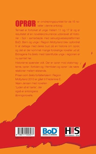 OPRØR er omdrejningspunktet for de 15 noveller i denne antologi. Temaet er fortolket af unge mellem 11 og 17 år og er resultatet af en novellekonkurrence udskrevet af Historier i Spil i samarbejde med selvudgivelsesplatformen BoD. Børn og unge i Region Midtjylland blev opfordret til at deltage med deres bud på en historie om oprør, og det er der kommet mange forskellige noveller ud af. Bidragene fra årets mest talentfulde unge i regionen er nu samlet her.