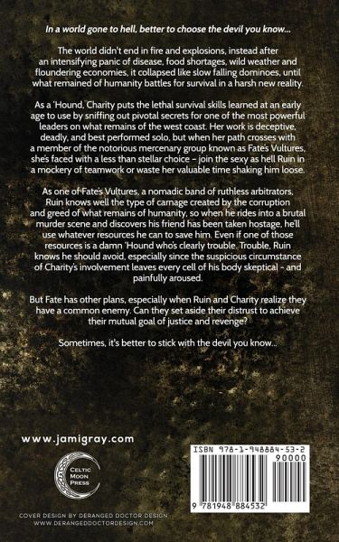 In a world gone to hell, better to choose the devil you know... The world didn't end in fire and explosions, instead after an intensifying panic of disease, food shortages, wild weather, and floundering economies, it collapsed like slow falling dominoes, until what remained of humanity battles for survival in a harsh new reality. As a 'Hound, Charity puts the lethal survival skills learned at an early age to use by sniffing out pivotal secrets for one of the most powerful leaders on what remains of the west coast. Her work is deceptive, deadly, and best performed solo, but when her path crosses with a member of the notorious mercenary group known as Fate's Vultures, she's faced with a less than stellar choice - join the sexy as hell Ruin in a mockery of teamwork or waste her valuable time shaking him loose. As one of Fate's Vultures, a nomadic band of ruthless arbitrators, Ruin knows well the type of carnage created by the corruption and greed of what remains of humanity, so when he rides into a brutal murder scene and discovers his friend has been taken hostage, he'll use whatever resources he can to save him. Even if one of those resources is a damn 'Hound who's clearly trouble. Trouble, Ruin knows he should avoid, especially since the suspicious circumstance of Charity's involvement leaves every cell of his body skeptical - and painfully aroused. But Fate has other plans, especially when Ruin and Charity realize they have a common enemy. Can they set aside their distrust to achieve their mutual goal of justice and revenge? Sometimes, it's better to stick with the devil you know... ****** ****** ****** ****** ****** ****** ****** ****** Dare to find out why readers are binging on this complete post-apocalyptic romance series from Jami Gray with this first in series, LYING IN RUINS and claim your copy now! Meet a new breed of warriors, Fate's Vultures, a mercenary band who live by a code in a world gone to hell - loyalty to each other, but for the right price, they'll be the shield for those without. In the ravaged aftermath of the post-apocalyptic these evocative couples will stop at nothing to claim their future. Welcome to the world of The Collapse. ****** ****** ****** ****** ****** ****** ****** ******
