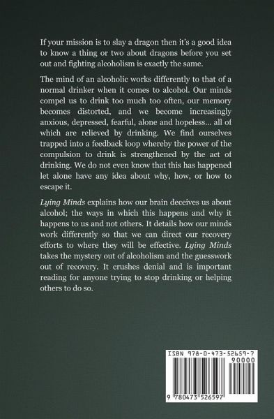Lying Minds: An Insiders guide to alcoholism Alcoholics are not damaged, faulty or broken, and we aren't bad or weak people; we are deceived: deceived by our own minds. Most people that drink heavily in their youth will mature out of it and those that drink to relieve some distress will moderate their drinking if that distress is removed, but we do not. Our minds do not spontaneously curb excessive drinking, they do the opposite: they encourage it. Alcohol changes the way that we think, lowers our mood, and distorts our memory. Our minds compel us to drink more and we become progressively more anxious, depressed, fearful, alone and hopeless... all of which are relieved by drinking. Drinking seems to us that it brings relief from our problems whereas in fact it amplifies them, so we drink more. This is how our minds trap us into a self-reinforcing pursuit of alcohol, and that does not happen to most other people. We are not broken or faulty but we are different. All people are different in some way. Some are tall, some are short, but we also all have unseen differences within us. Some are bolder that others, some more timid, some artistic and some more analytical. But we have differences that make us susceptible to addiction, and once that susceptibility is engaged then it forms into an ever strengthening force that propels us towards our own destruction. This book explains how our minds become deceived by alcohol and how it changes our motivation, emotions, memory and thinking. If you want to understand the "why's" of alcoholism; why we have to have that first drink, why we can't stop at one, why we drink more often than we intend, why we keep drinking even though bad things happen, and why we can't drink like normal people, then this book will tell you. It explains why we can never safely drink again, and the deeper truth... that we never could in the first place.