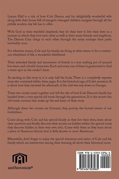 Lyman Hall is a tale of how Cole Damon and his delightfully wonderful wife along with their house full of energetic teenaged children navigate through all the pitfalls modern day life has to offer. With God as their watchful shepherd, they do their best to live their lives in a manner in which they love each other as well as their many friends and neighbors. The Damon Clan clings to each other through the many mishaps their paths inevitably cross. For whatever reason, Cole and his family are living in what seems to be a continuous whirlwind of life, a wonderful whirlwind. Their extended family and assortment of friends is a true melting pot of unusual but warm and colorful characters. Each and every one of them is guaranteed to find a warm spot in the reader's heart. As exciting as this story is, it is only half the book. There is a completely separate story also contained within these pages. It is the historical saga of Cole's ancestors. It is about how they survived the aftermath of the civil war way down in Georgia. These two stories mesh together and tell the tale of how Cole Damon's family has handed down a very special old trunk through the generations. It is the secrets this old trunk contains that make up the real heart of their story. Although these two stories are fictional, they portray the factual events of our forefathers. Come along with Cole and his special family as they live their lives, learn about their ancestors and finally discover what secrets are hidden within the special trunk they discover hidden in their very own attic. Come with them as they learn about a piece of American history that is little known to most Americans.