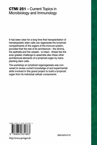 Human Mesenchymal Stem Cells: Progenitor Cells for Cartilage, Bone, Fat and Stroma.- Investigating the Genetic Control of Stem Cell Behavior.- Precursor B Cells from Pax-5-deficient Mice - Stem Cells for Macrophages, Granulocytes, Osteoclasts, Dendritic Cells, Natural Killer Cells, Thymocytes and T Cells.- Insertional Mutagenesis as a Route to Identifying Genes Involved in Self Renewal of Haemopoietic Stem Cells.- The Helix-Loop-Helix Inhibitor Id2 and Cell Differentiation Control.- Role of 131 Integrin for Hemato-Lymphopoiesis in Mouse Development.- The Ikaros Family and the Development of Early Intraembryonic Hematopoietic Stem Cells.- Function of Cytokines in Lymphocyte Development.- Re-evaluation of B Lymphocyte Lineage Differentiation Schemes.- Growth Factors Regulating Lymphatic Vessels.- Hemangioblastic Precursors in the Avian Embryo.- Cloning of JAM-2 and JAM-3: an Emerging Junctional Adhesion Molecular Family?.- Thymus Epithelial Cell Reaggregate Grafts.- A Novel Anti-Ep-CAM Antibody to Analyze the Organization of Thymic Medulla in Autoimmunity.- Genetic Dissection of Thymus Development.- Developing Thymocytes Organize Thymic Microenvironments.- The Role of Mesenchyme in Thymus Development.- Making Central T-Cell Tolerance Efficient: Thymic Stromal Cells Sample Distinct Self-Antigen Pools.- T Cell Activation and Polarization by DC 1 and DC2.- Functional Subsets of Memory T Cells Identified by CCR7 Expression.- Functional Organization of Secondary Lymphoid Organs by the Chemokine System.- The Cluster of ABCD Chemokines which Organizes T Cell-dependent B Cell Responses.- Affinity Maturation in Ectopic Germinal Centers.- Precursors to Neonatal Lymph Nodes: LT(3+CD45+CD4+CD3- Cells are Found in Fetal Liver.- The Role of Tumor Necrosis Factor and Lymphotoxin in Lymphoid Organ Development.