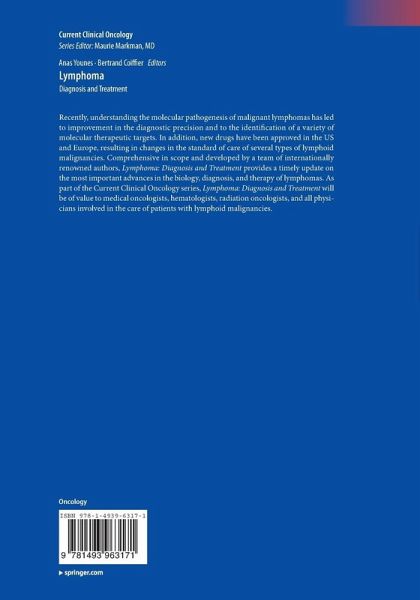 Recently, understanding the molecular pathogenesis of malignant lymphomas has led to improvement in the diagnostic precision and to the identification of a variety of molecular therapeutic targets. In addition, new drugs have been approved in the US and Europe, resulting in changes in the standard of care of several types of lymphoid malignancies. Comprehensive in scope and developed by a team of internationally renowned authors, Lymphoma: Diagnosis and Treatment provides a timely update on the most important advances in the biology, diagnosis, and therapy of lymphomas. As part of the Current Clinical Oncology series, Lymphoma: Diagnosis and Treatment will be of value to medical oncologists, hematologists, radiation oncologists, and all physicians involved in the care of patients with lymphoid malignancies.