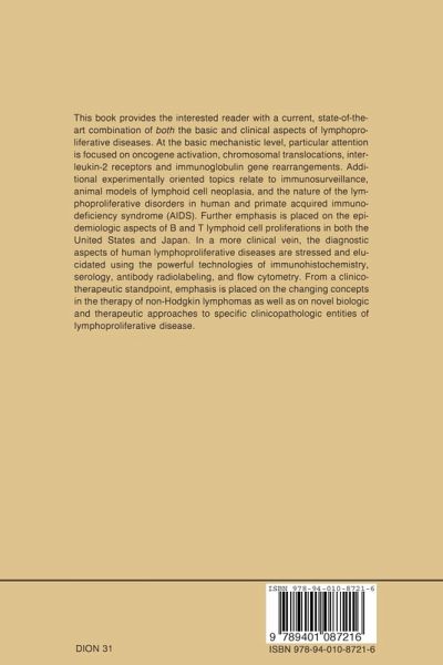 Pathobiology.- Oncogene Activation by Chromosomal Translocations.- Molecular Analysis of the Human Interleukin-2 Receptor.- DNA Rearrangements as Unique Molecular Markers of Clonality, Cellular Lineage, Differentiation, and Translocation.- Animal Models of Lymphoid Cell Neoplasia.- A New Look at the Relationship of the Immune System to Neoplasia.- Epidemiology.- The Epidemiology of Lymphomas.- Clinico-Epidemiological Features of Adult T-Cell Leukemia/Lymphoma (ATLL) in Japan: Relations of HTLV-I/ATLV Infection to ATLL Manifestation.- Diagnosis.- Immunohistologic Techniques: Their Impact in Tumor Diagnosis with Particular Reference to Lymphomas.- Serologic Approaches to Tumor Diagnosis.- Use of Radio-Labeled Antibodies in Diagnosis and Staging of Solid Tumors.- Flow Cytometry in Lymphoma/Leukemia Diagnosis.- Clinical Aspects.- Changing Concepts in Therapy of the Non-Hodgkin Lymphomas.- Biological Approaches to the Therapy of Lymphoproliferative Diseases.- A Comparison of the Acquired Immune Deficiency Syndrome in Monkey and Man.- Human T-Lymphotropic Retrovirus (HTLV-III)-Associated Lymphoproliferative Disorders in Homosexual Men.- Index of Subjects.
