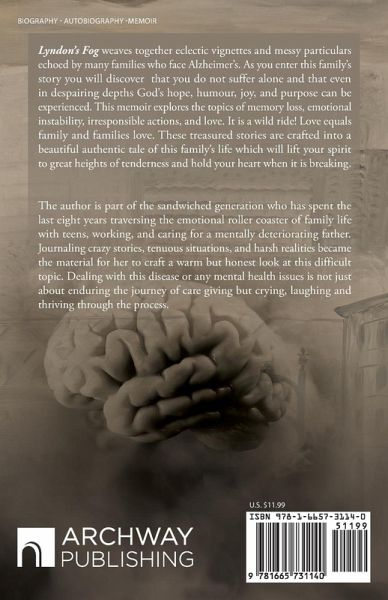 "Lyndon's Fog" weaves together an eclectic group of past vignettes with present events which are echoed by many families who encounter Alzheimer's. Exploring the topics of memory loss and taking responsibility while wading through the mucky morality of the diminishing brain is a wild ride. Every caregiver will grapple with either living lies or telling lies. A desperate lie is told to try to help the author's father believe the truth that his wife is dead. With a fragile mind, simple tasks like cooking and driving become impossible. Even though they grieve and fight their loss of independence, the care giver also grieves and fights to take on the responsibility of caring for their loved one. Juggling all these balls in life are compared to a memorable raft ride down a raging river. The journey begins with frustration, confusion follows, and nonsense swallows up reality. Filters on speech seem to fail, life values appear to be in flux, losses on every front increase, but joy can be found in the story of living. Recording the tenderness of her father's missed speech on her wedding day because he was thoughtfully driving his own dementia diseased mother-in-law back to the nursing home, embodies the cycle of life's motto-- love equals family and families love. Sweeping up a crawling carpet of white maggots out of the back of a jeep and fishing a wallet out of a smelly outhouse will bring tears and laughter that meld together as you enter this family's encounters. These and more treasured stories are crafted into a beautiful authentic tale of life shared. You will enter the emotional roller coaster and finally grieve when he breathes his last breath and death comes, even like taxes, inescapable; but there is purpose, even in all of this.