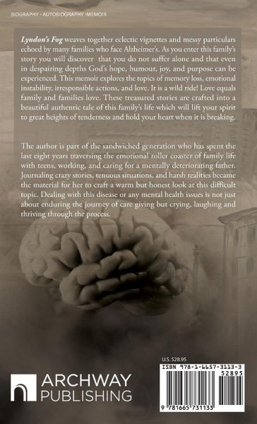"Lyndon's Fog" weaves together an eclectic group of past vignettes with present events which are echoed by many families who encounter Alzheimer's. Exploring the topics of memory loss and taking responsibility while wading through the mucky morality of the diminishing brain is a wild ride. Every caregiver will grapple with either living lies or telling lies. A desperate lie is told to try to help the author's father believe the truth that his wife is dead. With a fragile mind, simple tasks like cooking and driving become impossible. Even though they grieve and fight their loss of independence, the care giver also grieves and fights to take on the responsibility of caring for their loved one. Juggling all these balls in life are compared to a memorable raft ride down a raging river. The journey begins with frustration, confusion follows, and nonsense swallows up reality. Filters on speech seem to fail, life values appear to be in flux, losses on every front increase, but joy can be found in the story of living. Recording the tenderness of her father's missed speech on her wedding day because he was thoughtfully driving his own dementia diseased mother-in-law back to the nursing home, embodies the cycle of life's motto-- love equals family and families love. Sweeping up a crawling carpet of white maggots out of the back of a jeep and fishing a wallet out of a smelly outhouse will bring tears and laughter that meld together as you enter this family's encounters. These and more treasured stories are crafted into a beautiful authentic tale of life shared. You will enter the emotional roller coaster and finally grieve when he breathes his last breath and death comes, even like taxes, inescapable; but there is purpose, even in all of this.