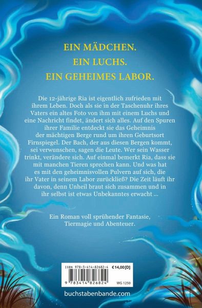 Ria ist zwölf und lebt seit sie ein Baby war bei ihrer Tante. Ihre Eltern kamen auf mysteriöse Weise in Firnspiegel um Leben, wo sie im Theater über den Wolken auftraten. Als Ria aber in der Taschenuhr ihres Vaters ein Foto von ihm mit einem Luchs findet, wird sie neugierig und möchte mehr über das Leben ihrer und die Vergangenheit erfahren. Gemeinsam mit ihrer Tante reist sie in den ihr unbekannten Ort, von dem die Bewohner seltsame Geschichten erzählen. Zum Beispiel soll das Wasser im Gebirgsbach die Menschen verändern. Auch Ria nimmt plötzlich Veränderungen an sich wahr, sie hört besser und nimmt Tierstimmen wahr. Als sie entdeckt, dass ihr Vater im Theate in einem kleinen Labor eine seltsame Substanz erforscht hat, versucht sie, dem Geheimnis der Vergangenheit auf die Spur zu kommen. Sie ahnt jedoch nicht, dass auch jemand anderes Interesse an ihren Nachforschungen hat.
