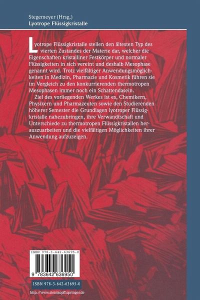 Lyotrope Flüssigkristalle stellen den ältesten Typ des vierten Zustandes der Materie dar, welcher die Eigenschaften kristalliner Festkörper und normaler Flüssigkeiten in sich vereint und deshalb Mesophase genannt wird. Trotz vielfältiger Anwendungsmöglichkeiten in Medizin, Pharmazie und Kosmetik führen sie im Vergleich zu den konkurrierenden thermotropen Mesophasen immer noch ein Schattendasein. Ziel dieses Buches ist es, den Chemikern, Physikern und Pharmazeuten sowie Studenten höherer Semester die Grundlagen lyotroper Flüssigkristalle nahezubringen, ihre Verwandtschaft sowie Unterschiede zu thermotropen Flüssigkristallen herauszuarbeiten und die vielfältigen Möglichkeiten ihrer Anwendung aufzuzeigen.