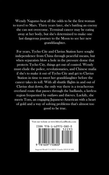 Wendy Nagumo beat all the odds to be the first woman to travel to Mars. Thirty years later, she's battling an enemy she can not overcome. Terminal cancer may be eating away at her body, but she's determined to make one last dangerous journey to the Moon to see her new granddaughter. For years, Tycho City and Clavius Station have sought independence from China through peaceful means, but when separatists blow a hole in the pressure dome that protects Tycho City, things get out of control. Wendy must elude the police, revolutionaries, and Chinese mafia if she's to make it out of Tycho City and get to Clavius Station in time to meet her granddaughter before the cancer takes its toll. With all shuttle flights in and out of Clavius shut down, the only way there is a treacherous overland route that passes through the badlands, a lawless region frequented by outlaws and thieves. Luckily, she meets Tom, an engaging Japanese-American with a heart of gold and a way of solving problems that's almost too good to be true.