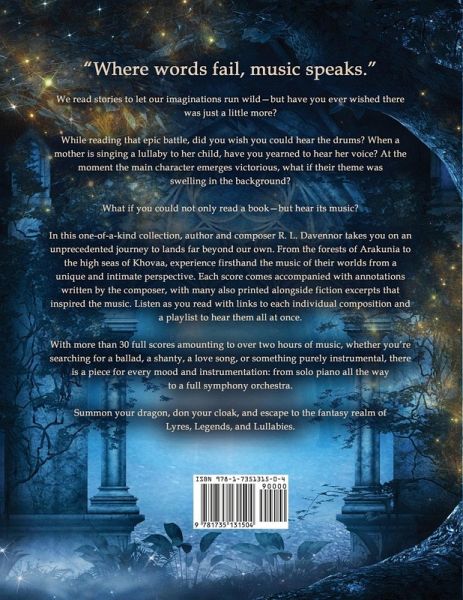 "Where words fail, music speaks." We read stories to let our imaginations run wild-but have you ever wished there was just a little more? While reading that epic battle, did you wish you could hear the drums? When a mother is singing a lullaby to her child, have you yearned to hear her voice? At the moment the main character emerges victorious, what if their theme was swelling in the background? What if you could not only read a book-but hear its music? In this one-of-a-kind collection, author and composer R. L. Davennor takes you on an unprecedented journey to lands far beyond our own. From the forests of Arakunia to the high seas of Khovaa, experience firsthand the music of their worlds from a unique and intimate perspective. Each score comes accompanied with annotations written by the composer, with many also printed alongside fiction excerpts that inspired the music. Listen as you read with links to each individual composition and a playlist to hear them all at once. With more than 30 full scores amounting to over two hours of music, whether you're searching for a ballad, a shanty, a love song, or something purely instrumental, there is a piece for every mood and instrumentation: from solo piano all the way to a full symphony orchestra. Summon your dragon, don your cloak, and escape to the fantasy realm of Lyres, Legends, and Lullabies. ¿Please be aware the fictional prose contains adult language and themes, and that reader discretion is advised.