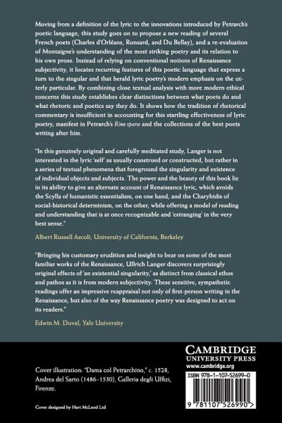 Moving from a definition of the lyric to the innovations introduced by Petrarch's poetic language, this study goes on to propose a new reading of several French poets (Charles d'Orléans, Ronsard, and Du Bellay), and a re-evaluation of Montaigne's understanding of the most striking poetry and its relation to his own prose. Instead of relying on conventional notions of Renaissance subjectivity, it locates recurring features of this poetic language that express a turn to the singular and that herald lyric poetry's modern emphasis on the utterly particular. By combining close textual analysis with more modern ethical concerns this study establishes clear distinctions between what poets do and what rhetoric and poetics say they do. It shows how the tradition of rhetorical commentary is insufficient in accounting for this startling effectiveness of lyric poetry, manifest in Petrarch's Rime Sparse and the collections of the best poets writing after him.