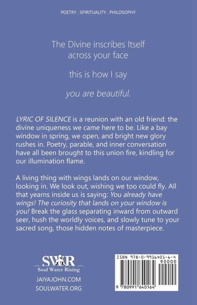 Lyric of Silence is a reunion with an old friend: the divine uniqueness we came here to be. Like a bay window in spring, we open, and bright new glory rushes in. Poetry, parable, and inner conversation have all been brought to this union fire, kindling for our illumination flame. A living thing with wings lands on our window, looking in. We look out, wishing we too could fly. All that yearns inside us is saying: You already have wings! The curiosity that lands on your window is you! Break the glass separating inward from outward seer, hush the worldly voices, and slowly tune to your sacred song, those hidden notes of masterpiece.