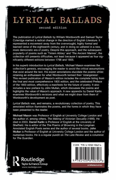 In his superb introduction to Lyrical Ballads, Michael Mason examines the collection's genesis, encouraging the reader to avoid the critical assumptions that exist around the text; his expert annotations elucidate the poems whilst retaining an enthusiasm for what Wordsworth termed their 'strangeness'. This revised publication of Mason's edition includes the complete listing from the final - and most comprehensive - 1805 edition, and the celebrated Preface of the 1800 edition, effectively a manifesto for the future of poetry.