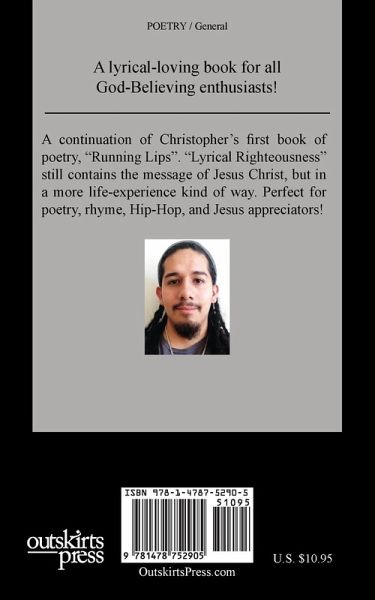 A continuation of Christopher's first book "Running Lips". Lyrical Righteousness is poetic and loving way to learn to appreciate the art of rapping in the Hip-Hop Culture and to come to a closer more intimate relationship with Jesus Christ (if you do not already have a relationship with Him). It is filled with romance, adventure and perhaps a way for you to get out of a difficult circumstance such as, an unsteady relationship, or just trying to believe in God or see if He is real or not. I can only speak on my behalf that I Believe and I hope this book will inspire you or motivate you to become a better follower of Christ or just a more uplifting person in general. Thank You!