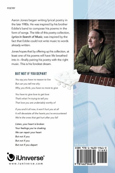 Aaron Jones began writing lyrical poetry in the late 1980s. He was inspired by his brother Eddie's band to compose his poems in the form of songs. The title of this poetry collection, Lyrics in Search of Music , was inspired by the fact that Eddie could not write music to words already written. Jones hopes that by offering up his collection, at least one of his poems will have life breathed into it-finally pairing his poetry with the right music. This is his fondest dream. But Not If You Depart You say you have no reason to live But can you tell me why Why, you think, you have no more to give You have to give love to get love That's what I'm trying to tell you That love you are undeniably worthy of If you end it all now, it won't hurt you at all It will devastate all the hearts you've encountered We're the ones that get hurt after you fall Listen, your heart is broken Your feelings you're cloaking We can repair your heart But not if you But not if you But not if you depart